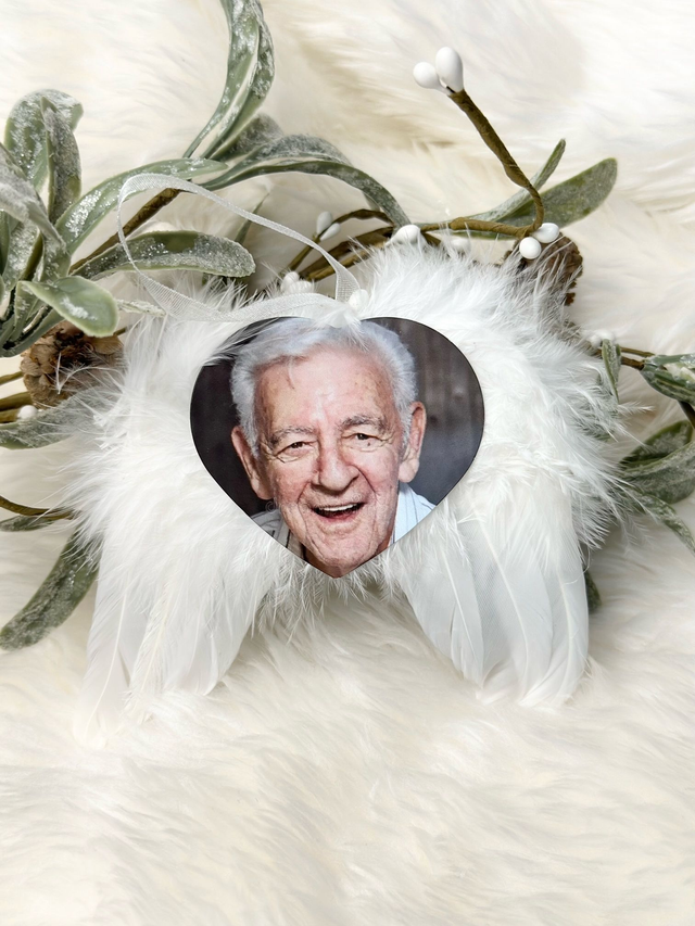 Introducing our exquisite Angel Wing Decoration that's made with real feathers and features a printed photograph of your loved one.