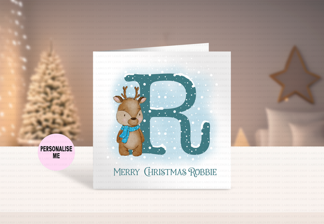 Our personalised Christmas card features a super cute reindeer design, available in a boy or girl initial version.