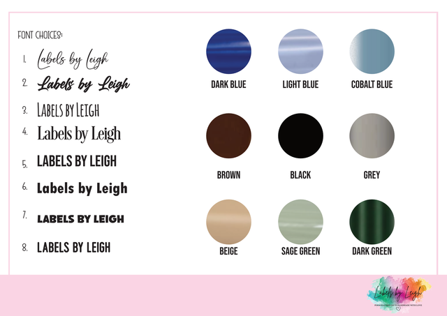 Choose from a variety of colours to complement your suit and select a font that suits your style.