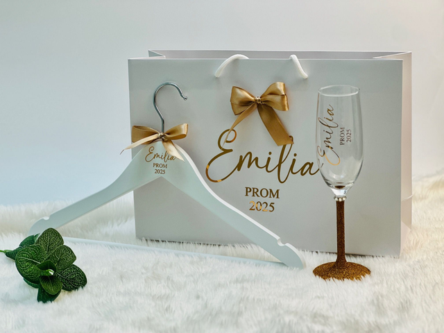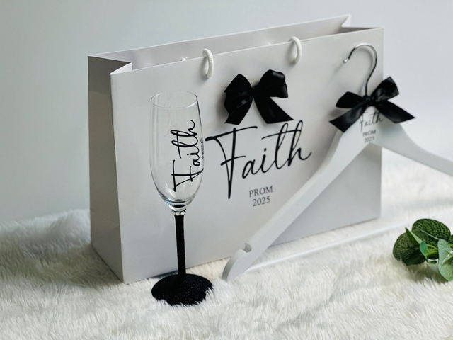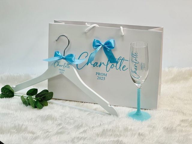 Make prom night truly unforgettable with our personalised glitter stem glass, hanger and gift bag set.